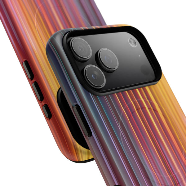 Vertical streaks of fiery reds, oranges, and yellows blend with cooler purples and blues, creating a mesmerizing gradient effect that's both modern and artistic.