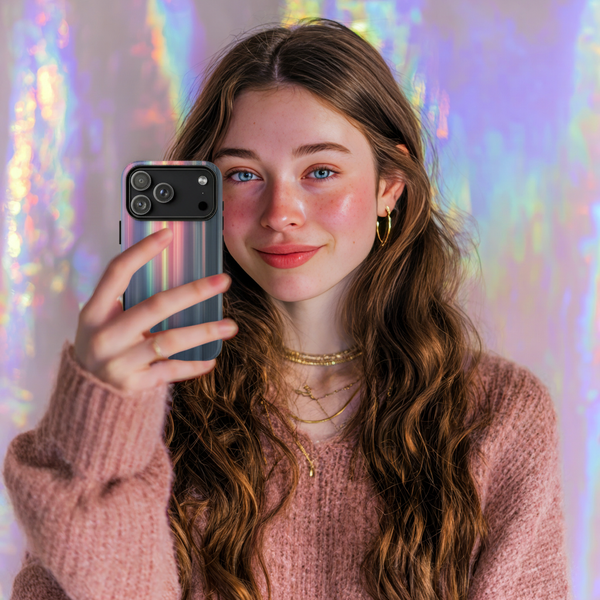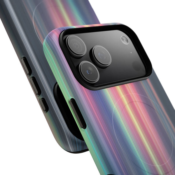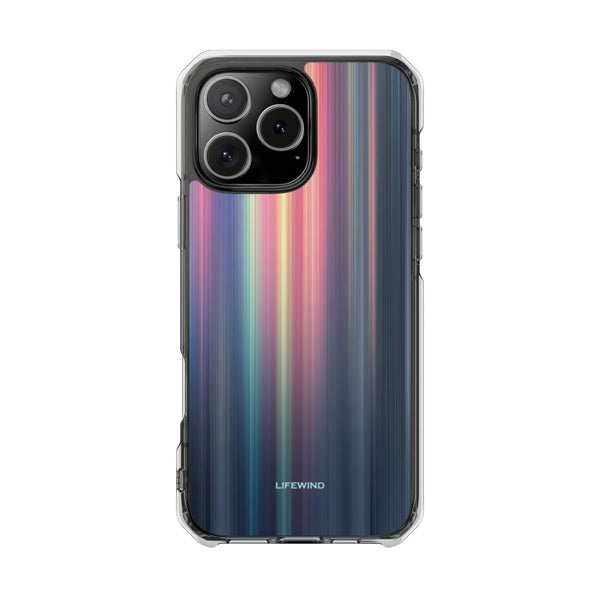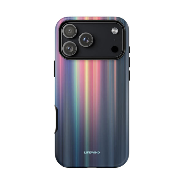 Vertical bands of shimmering color in hues of pink, yellow, blue, and purple give the design a dreamlike, abstract feel that is both calming and sophisticated.