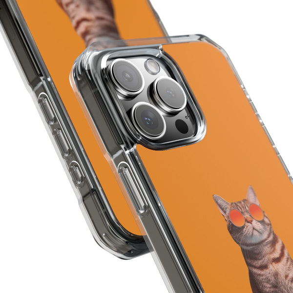 This eye-catching design features a cool cat wearing vibrant orange sunglasses against a bold orange backdrop, creating a playful and cheerful vibe.