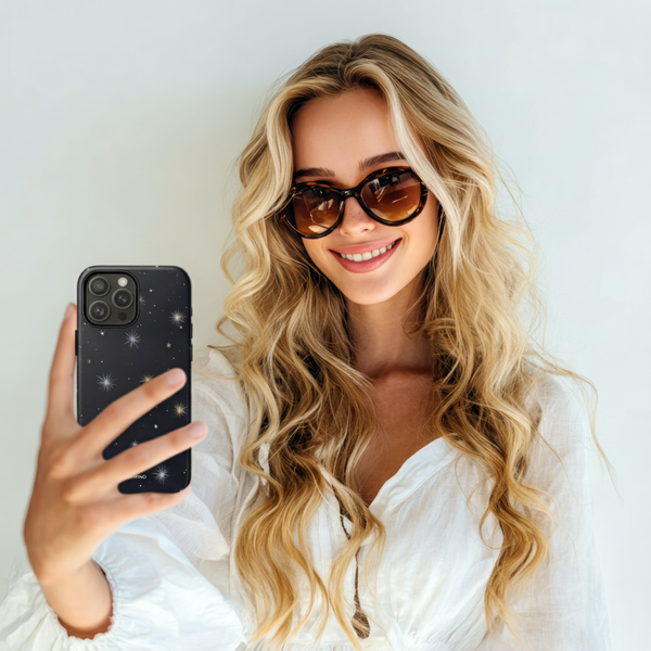 Gaze at the stars with this dreamy case, featuring a deep navy backdrop illuminated with sparkling silver and gold starbursts.