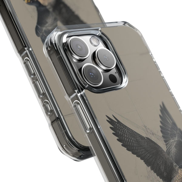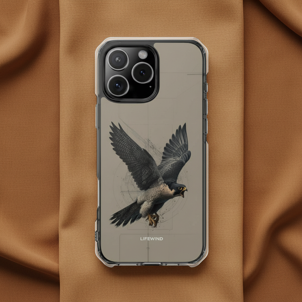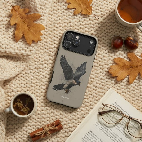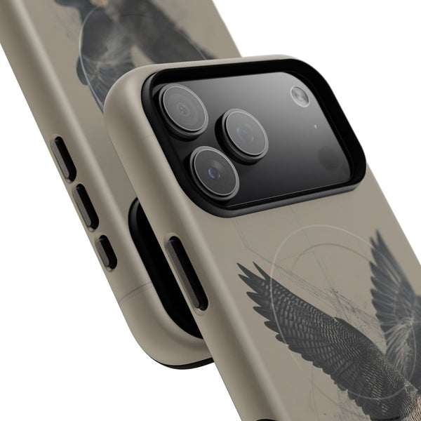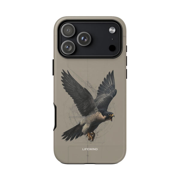 This phone case features a striking illustration of a falcon in mid-flight, rendered in detailed black and grey tones against a muted beige background with subtle schematic lines.
