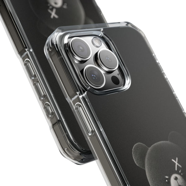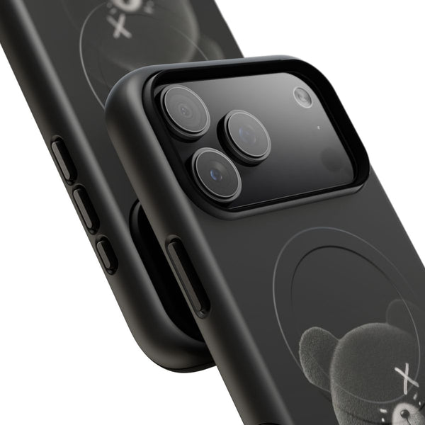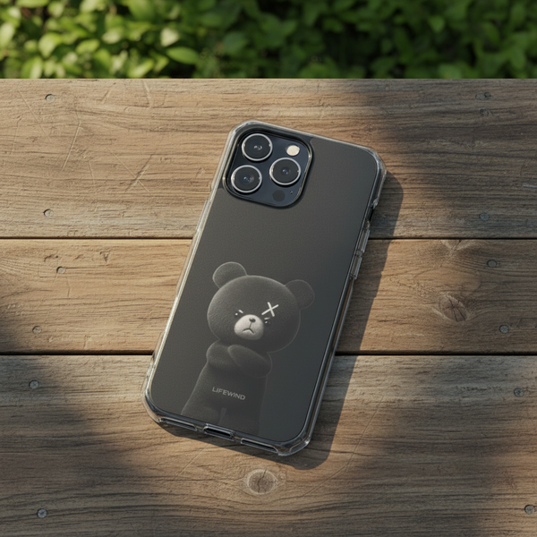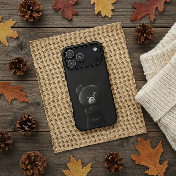 This phone case features a matte black design with a whimsical, 3D-rendered bear character that exudes a slightly grumpy, yet endearing, charm.