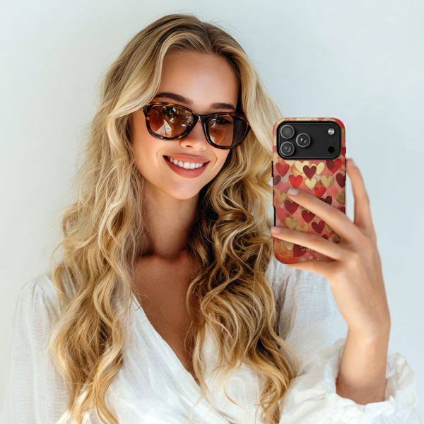 An array of hearts in coordinating reds and shimmering golds creates a playful, painterly feel, radiating love and passion with a touch of elegance.